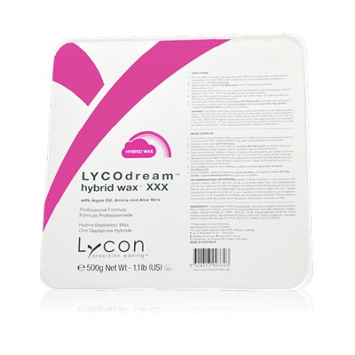 LYCOdream Hybrid Wax indeholder Lycon’s unikke Titanium Dioxide teknologi og Micro Mica for en 1. klasses beskyttelse af huden samt Argan Olie, Arnica og Aloe Vera, som efterlader huden superblød, helt rolig, plejet og hårfri. Ekstra god til begyndere, da den er meget fleksibel at arbejde med.